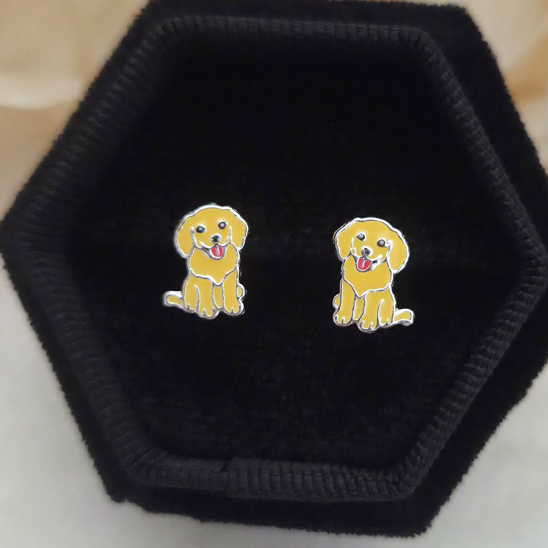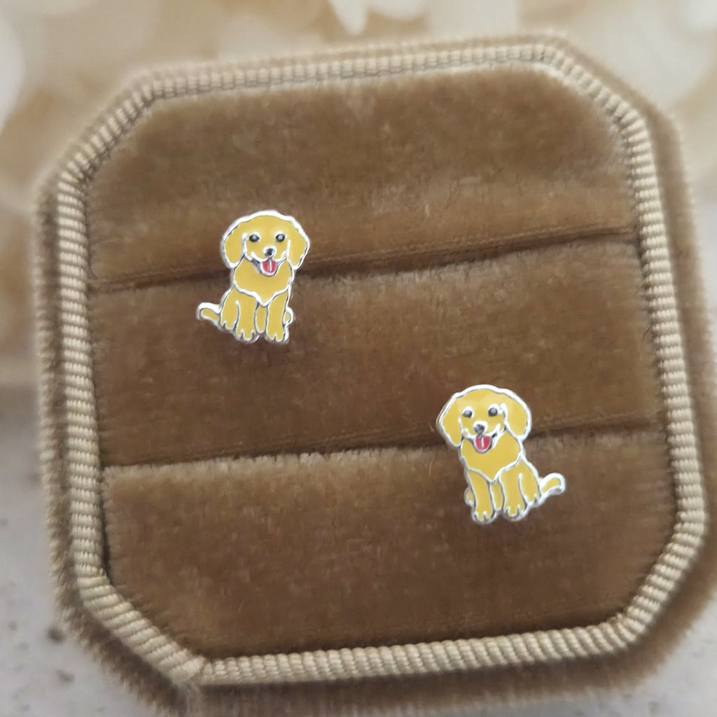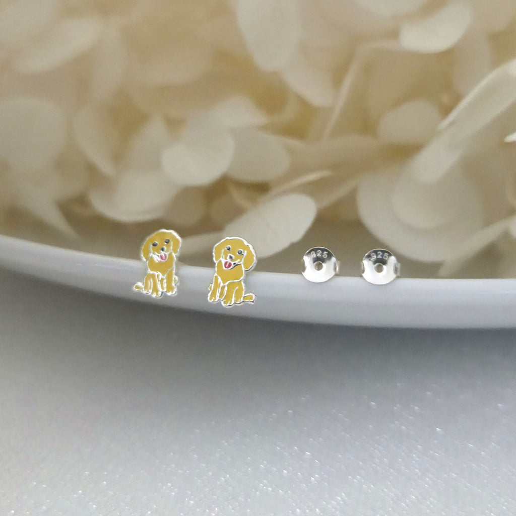 Adorable yellow dog stud earrings in solid 925 sterling silver, detailed with bright enamel for a cheerful look. A fun and charming gift for pet lovers.