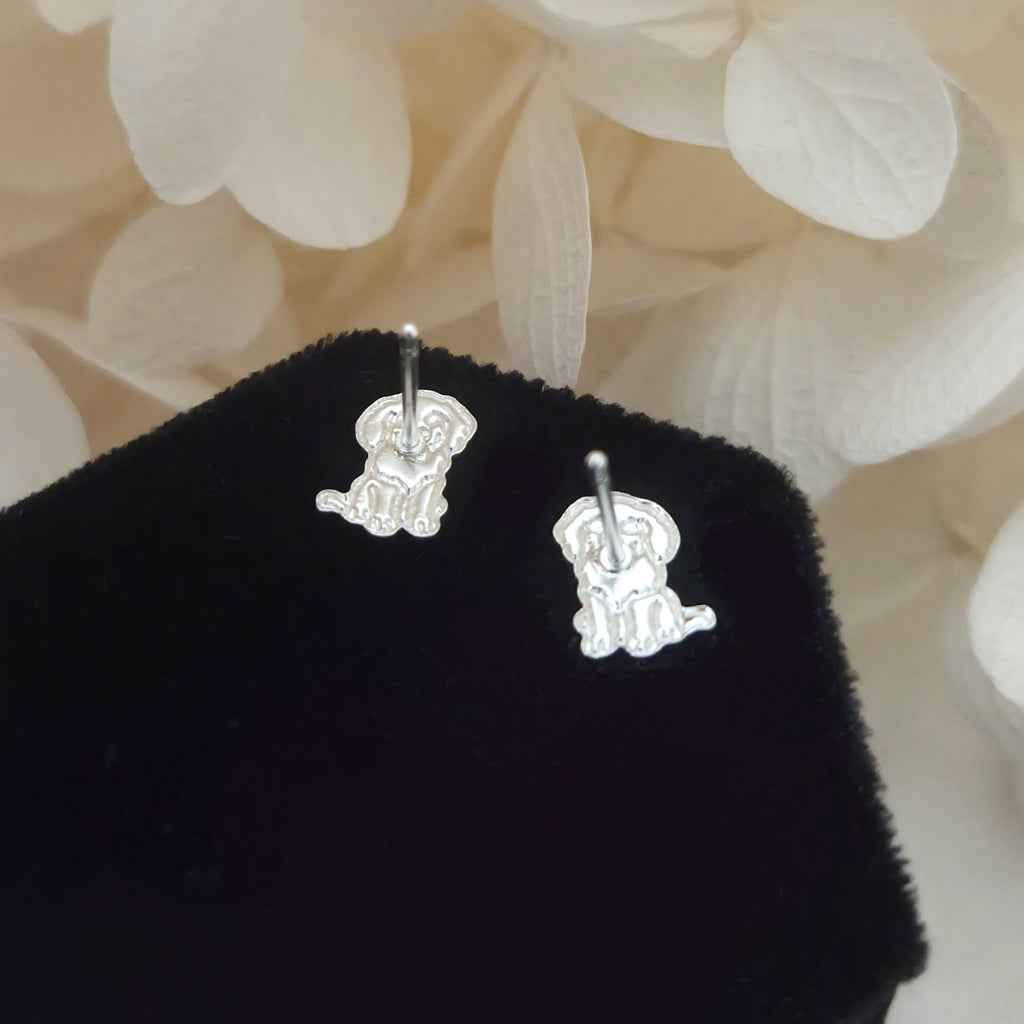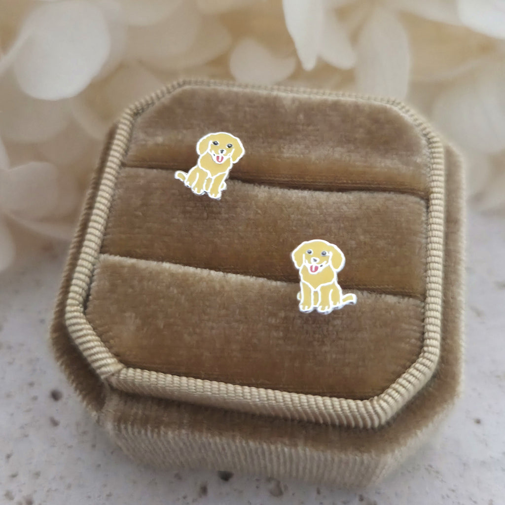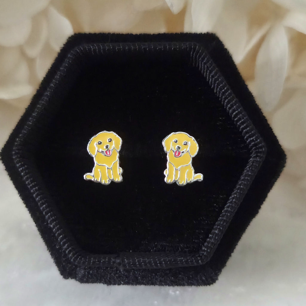 Adorable yellow dog stud earrings in solid 925 sterling silver, detailed with bright enamel for a cheerful look. A fun and charming gift for pet lovers.